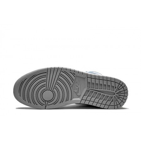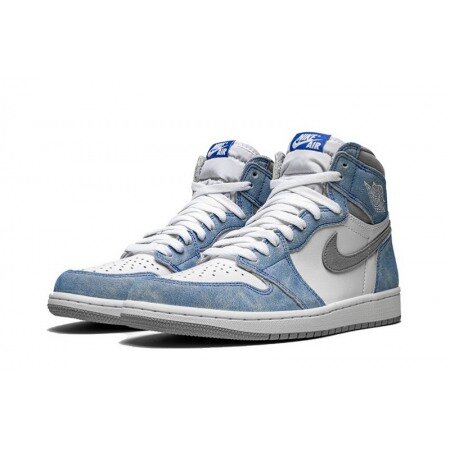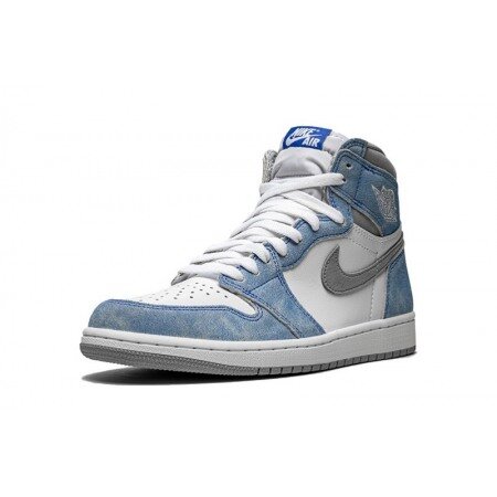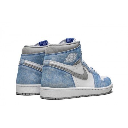 The upper of the Air Jordan 1 Hyper Royal is constructed with white leather and distressed Hyper Royal suede overlays while the Swoosh and panels around the ankle are made with a Light Smoke Grey Durabuck. Consistent with Jordan 1s of the past, a classic white "Wings" logo appears on the lateral ankle. A blue woven Nike Air label stitched on the tongue, a white midsole, and a Light Smoke Grey outsole add the finishing touches to this retro design.