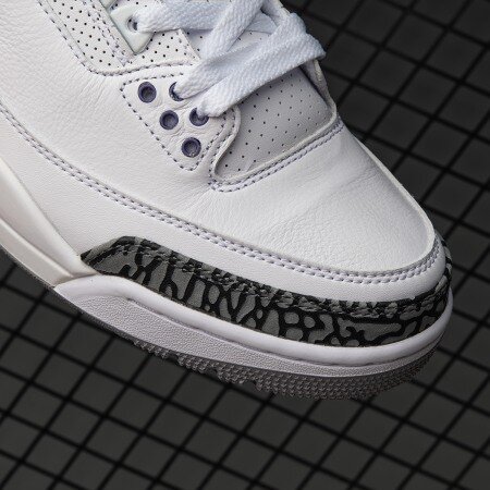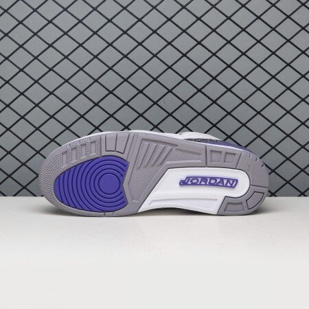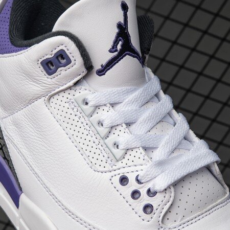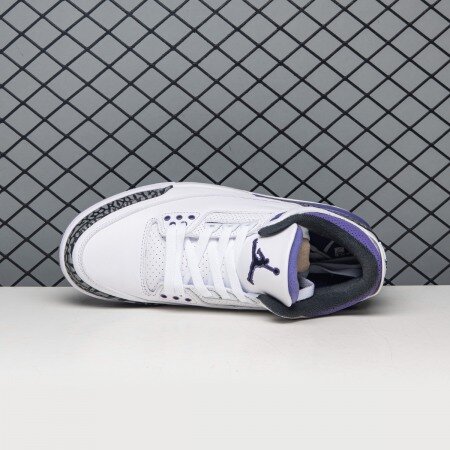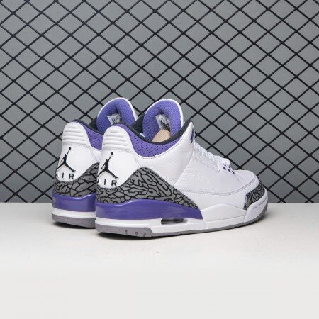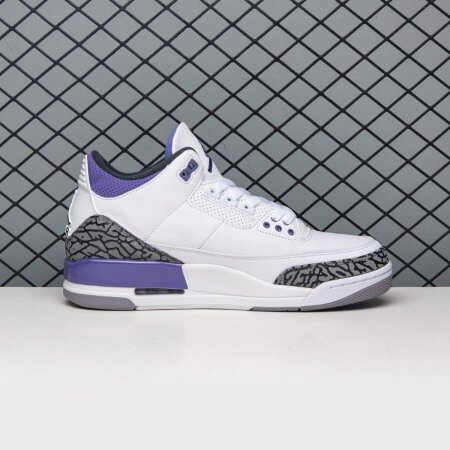 The Air Jordan 3 Retro 'Dark Iris' brings a revitalized color palette to the hardwood classic that introduced visible Air cushioning to the Jordan franchise. The sneaker utilizes a white tumbled leather upper with signature elephant print overlays in a dark grey finish. Violet accents make their way to the eyelets, perforated collar and the rear of the polyurethane midsole. Jumpman branding hits adorn the leather tongue and molded heel overlay. Underfoot, a grey rubber outsole provides durable traction.