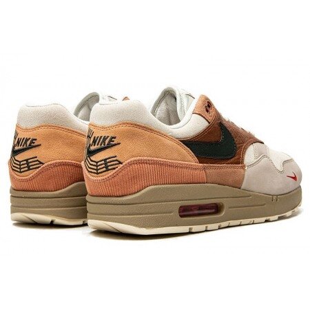 The Nike Air Max 1 Amsterdam features a red and peach corduroy, suede, and leather upper, with warm tones such as Red Bark around the midsection of the Amsterdam. From there, embellishments that show off the "Nike Air" brand dot the back of the heel, and a chunky "Air Max" sole completes the design.