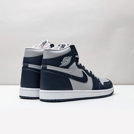 Drawing inspiration from the Nike Terminator Georgetown, the Air Jordan 1 High '85 Georgetown features a classic two-tone color blocked look, with a smooth grey leather upper and College Navy overlays. A yellowed nylon tongue with a woven Nike label nods to the appeal of vintage 1985 Jordan 1s. At the base, a white and navy air sole completes the design.