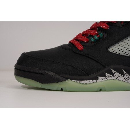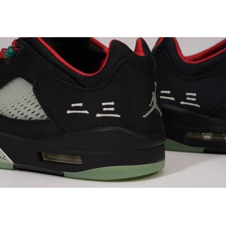The Air Jordan 5 Low CLOT Jade celebrates China's appreciation for jade, as its heritage and tradition is infused with greatness. The design features a black satin-like upper with semi-translucent TPU netted inserts and light grey heel embroideries. Attached to the red woven laces, clear jade beads add further decoration. At the base, a midsole similar to the Jordan 5 Metallic and a jade semi-translucent outsole complete the design.