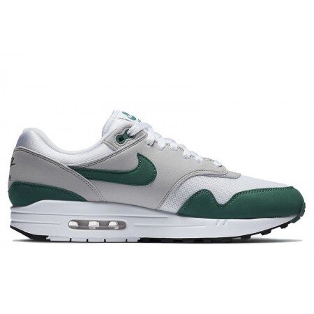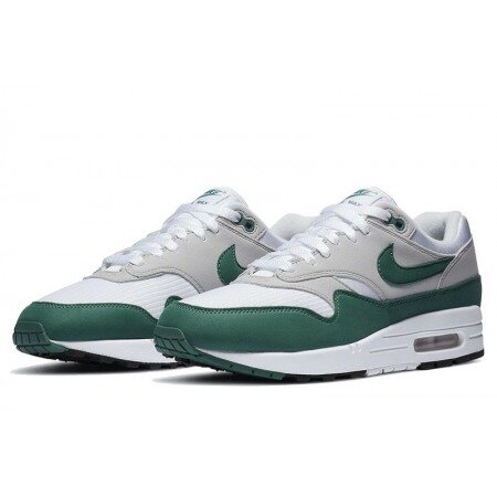 The Nike Air Max 1 Anniversary Green (2020) features a white, Evergreen Aura, and gray leather and mesh upper, with white acting as a background that feeds into Evergreen Aura mudguards and gray overlays. From there, an "Air Max" midsole with exposed pods sits atop a two-toned outsole and slight black accents for bordering to complete the design.