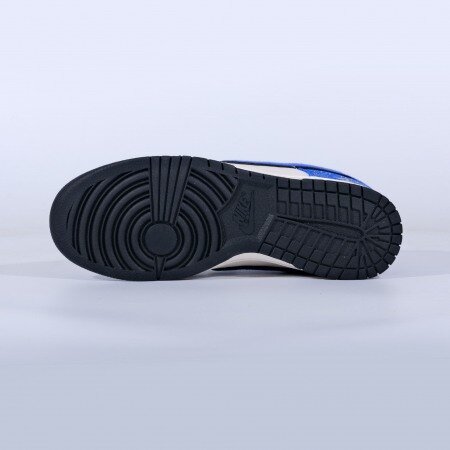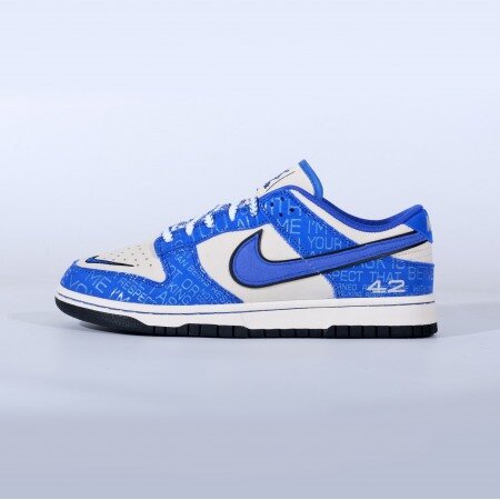 The Nike Dunk Low Jackie Robinson boasts a Brooklyn Dodgers color palette with a light grey Durabuck upper, royal blue leather overlays, an embroidered mini-Swoosh at the toe, and a felted side Swoosh - reminiscent of baseball caps in the late-1940s. Throughout the design, Robinson's famous quote, "I'm not concerned with you liking or disliking me. All I ask is that you respect me as a human being", is printed in a pattern format. At the heel, Robinson's number 42 is embroidered, providing a custom feel.
