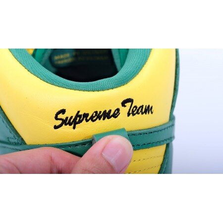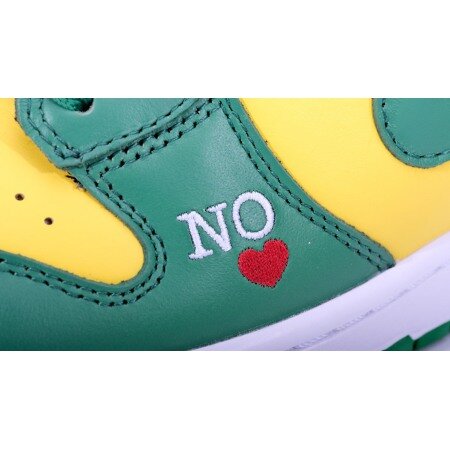 The Nike SB Dunk High Supreme By Any Means Brazil nods to a Nike Dunk High Pro B Brazil, a Japanese-exclusive Nike Dunk CO.JP colorway from 2002. It features a yellow leather upper with green overlays and Swooshes. Customized "SUP" woven tongue labels, "By Any Means" and Nike NYC heel embroideries, "Supreme Team" collar embroidery, and a "No Love" toe embroidery add a novelty touch.