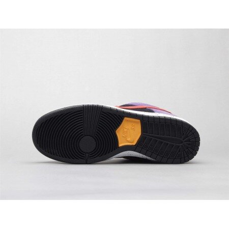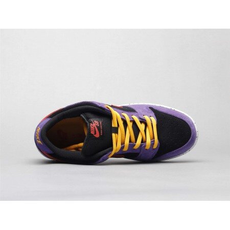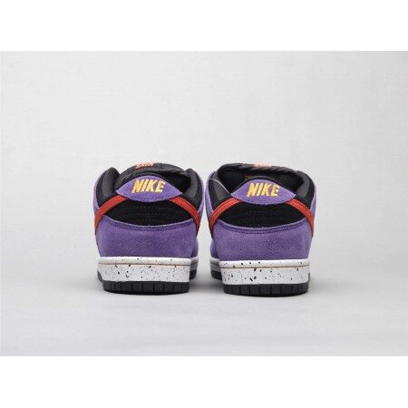 The Nike SB Dunk Low ACG features a black upper with purple suede overlays and a red Nike Swoosh. A white speckled midsole, orange detailing, and black outsole complete the design.