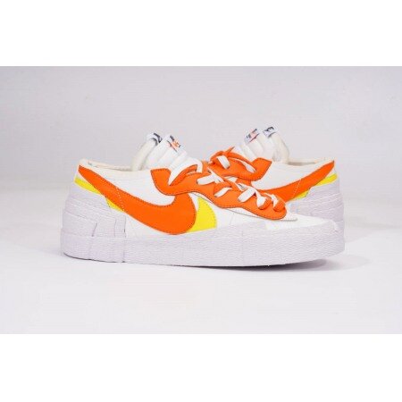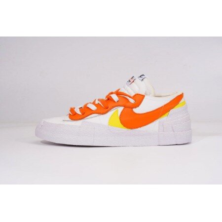 The Nike Blazer Low sacai White Magma Orange arrives in a white leather upper with Magma Orange and yellow overlays. A duplicated tongue and overlapped white sole that stacks around the heel finishes off the design.