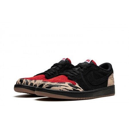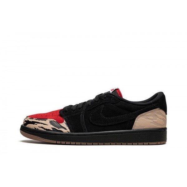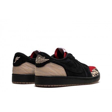 The Air Jordan 1 Low Solefly draws inspiration from the carnivorous wildlife of the Florida Everglades. Smothered in ferocious patterns, beige debossed toe wrap and heel wrap pop against a black and red premium suede upper. From there, SoleFly and Air Jordan logos on the heel tabs add a custom feel.
